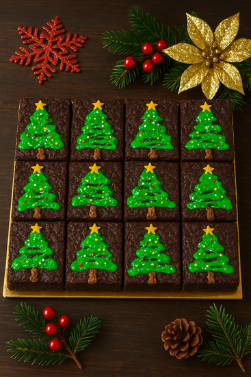 A rich, fudgy brownie that’s soft in the center with a lightly crisped top, packed with crunchy walnut pieces in every bite. Each of the 12 pieces is adorned with a cheerful Christmas tree design, piped with green chocolate ganache for a festive sparkle. Perfect for sharing with loved ones, gifting to friends, or simply enjoying a moment of holiday decadence.